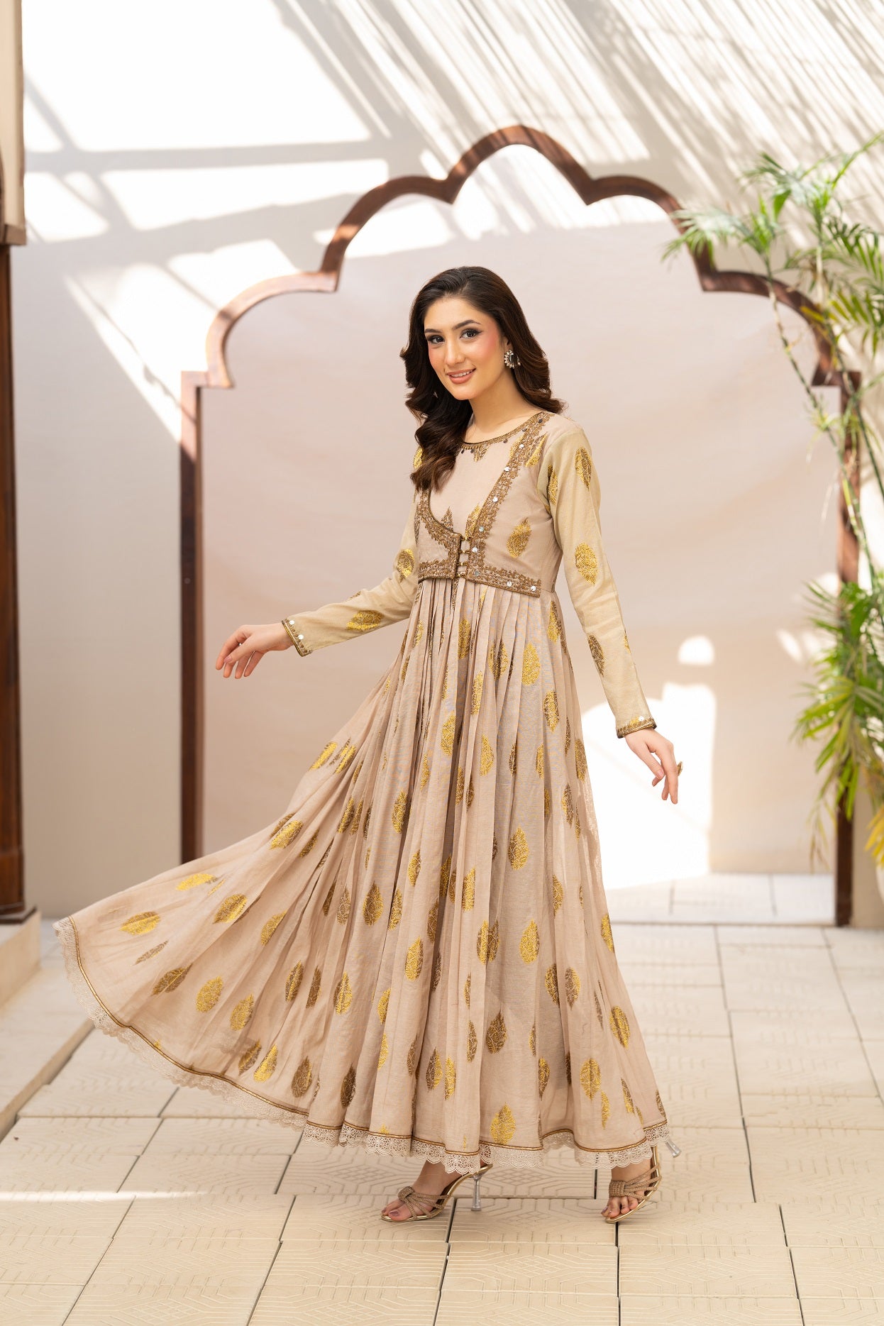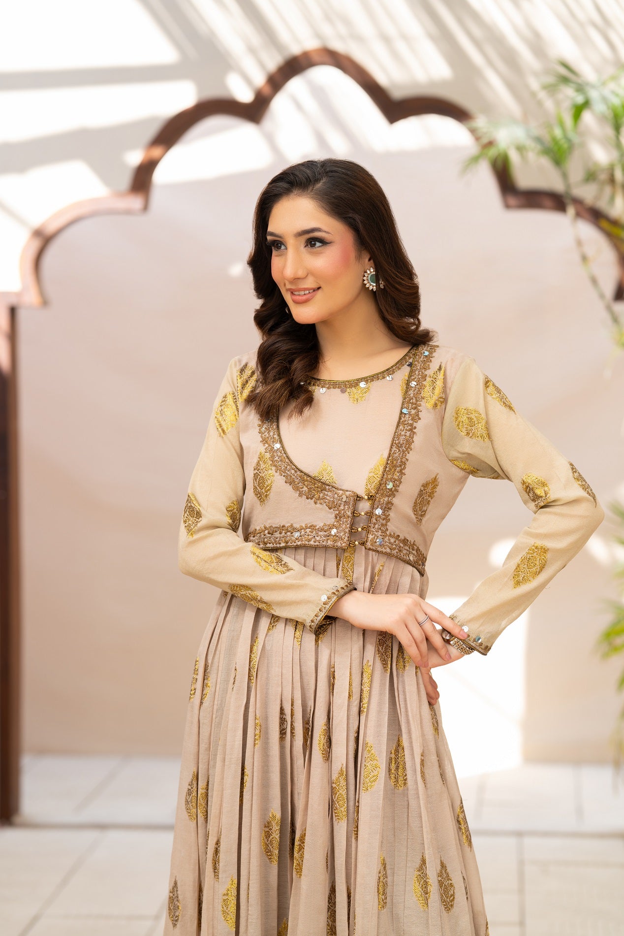 NF-6568 Beige Jacquard pleated Frock
