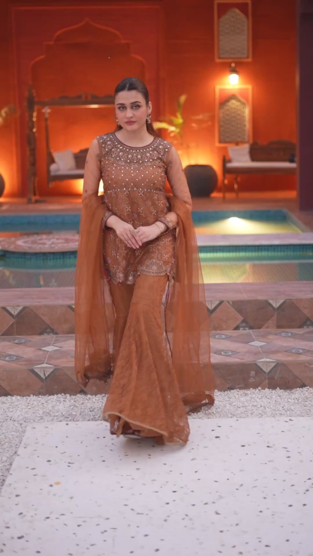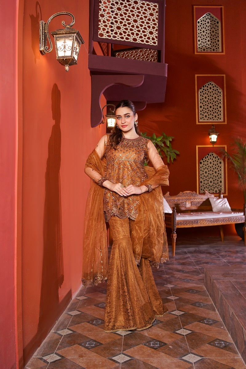 NF-5987 Golden Shirt Gharara Stitched Dress