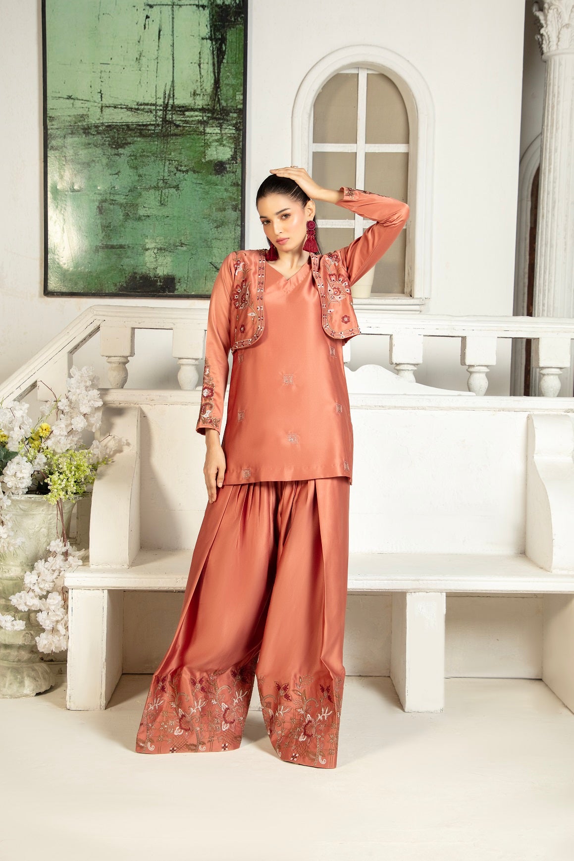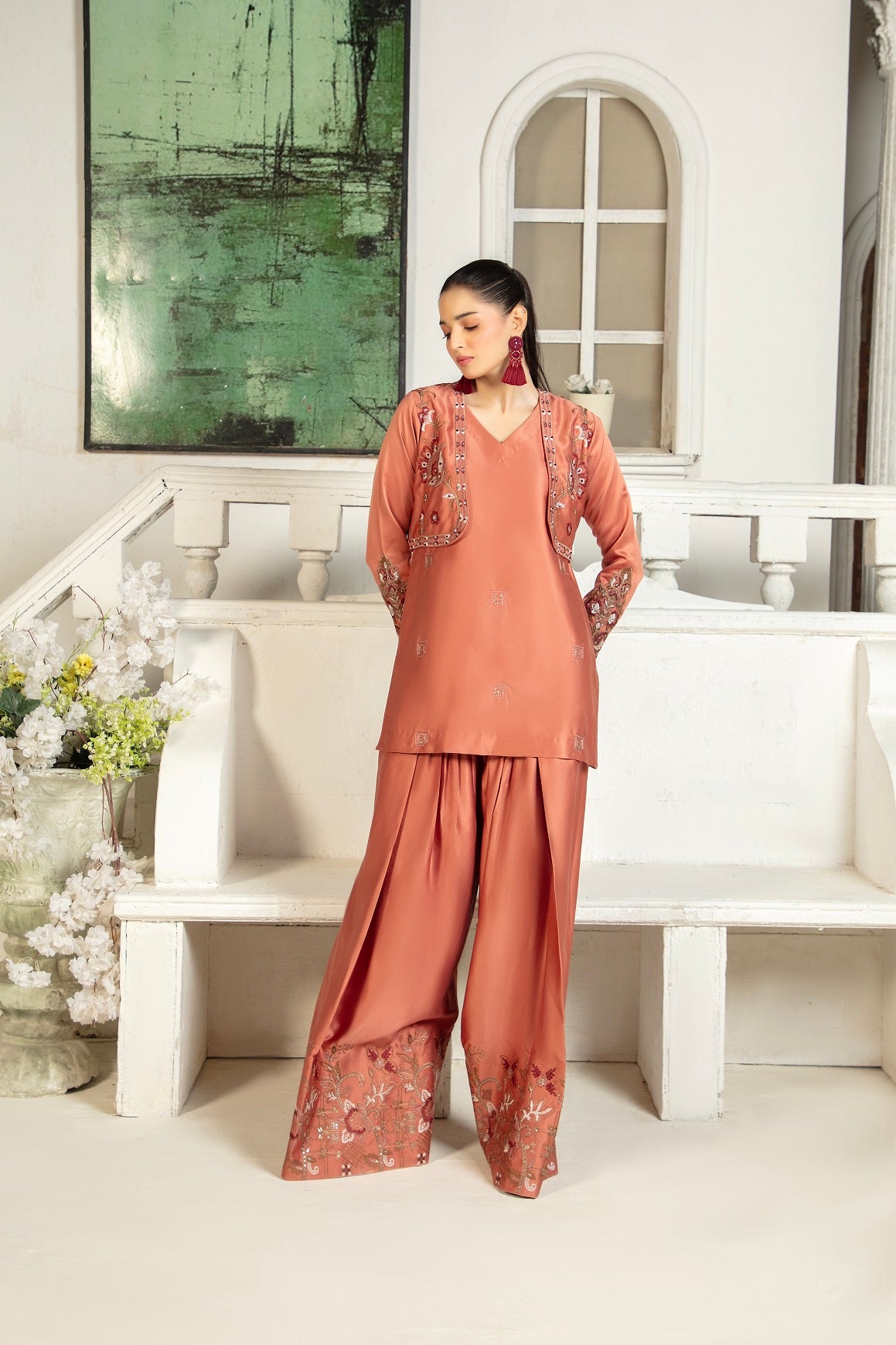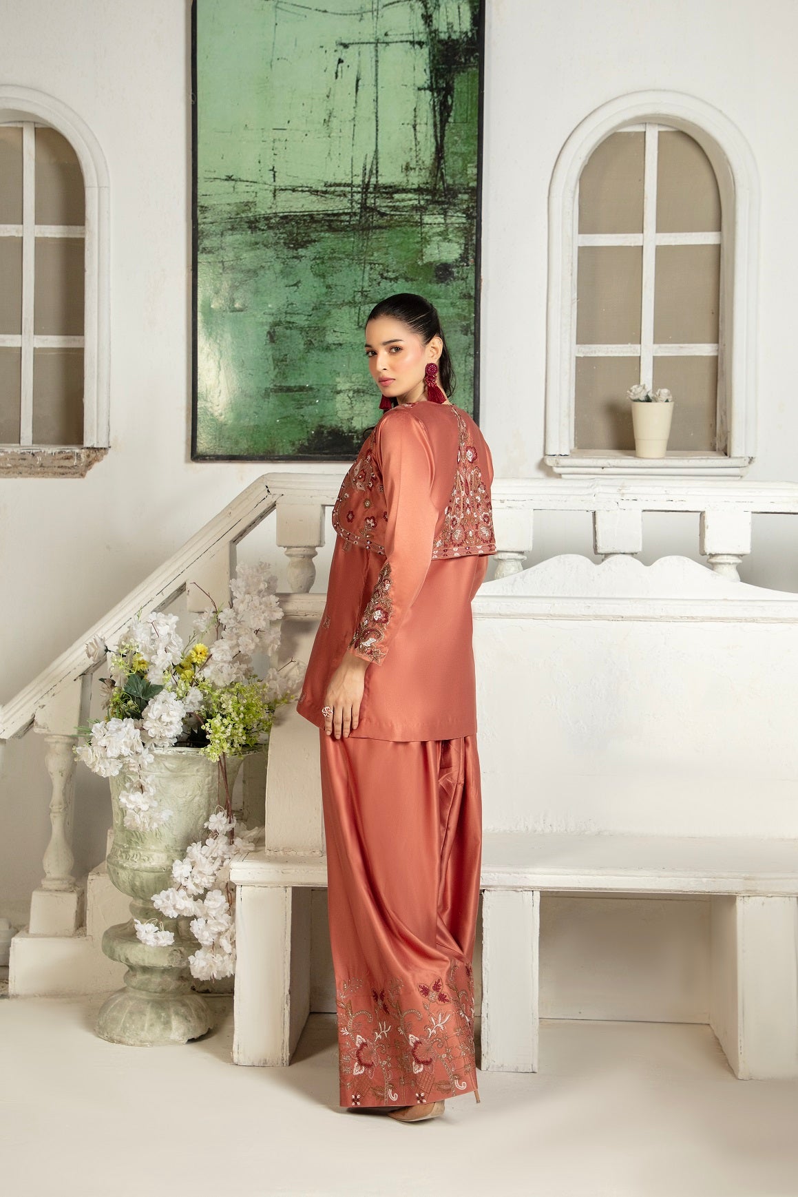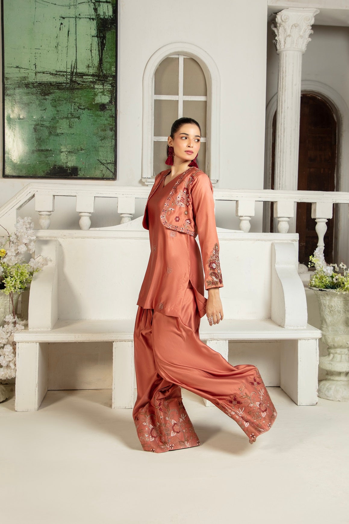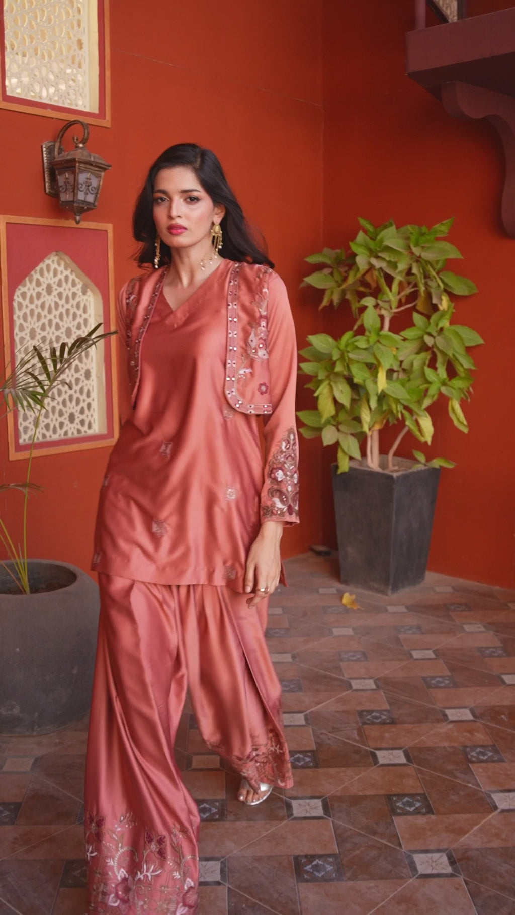 Rose Gold Embroidered Farshi Shalwar Paired With Short Shirt with Coaty
