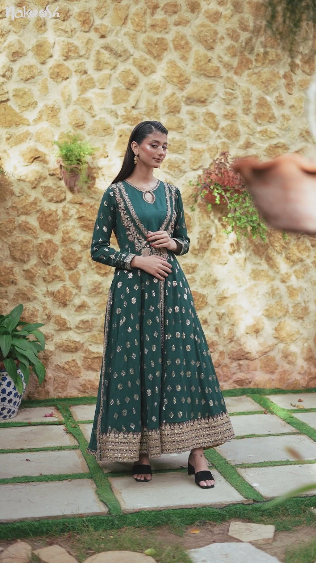 NF-6437 Bottle Green Jacquard Stitched Dress
