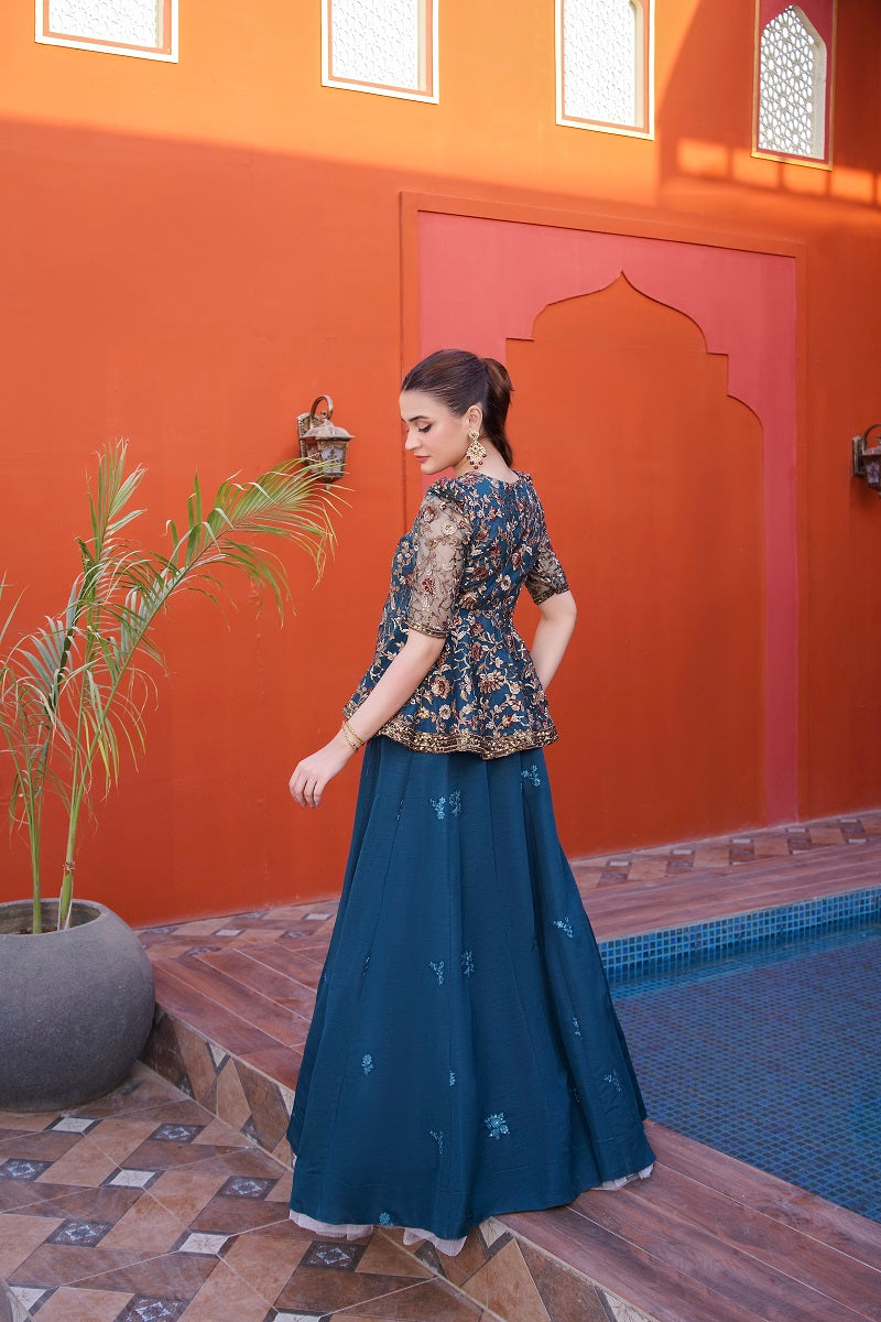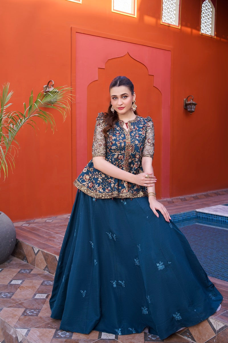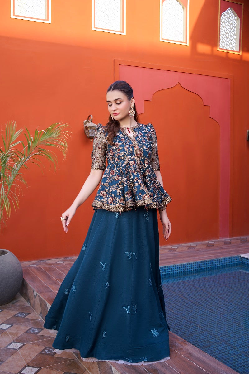 Peplum Shirt Net Embroidered Fabric Lehnga Rawsilk Fabric wth cancan attached