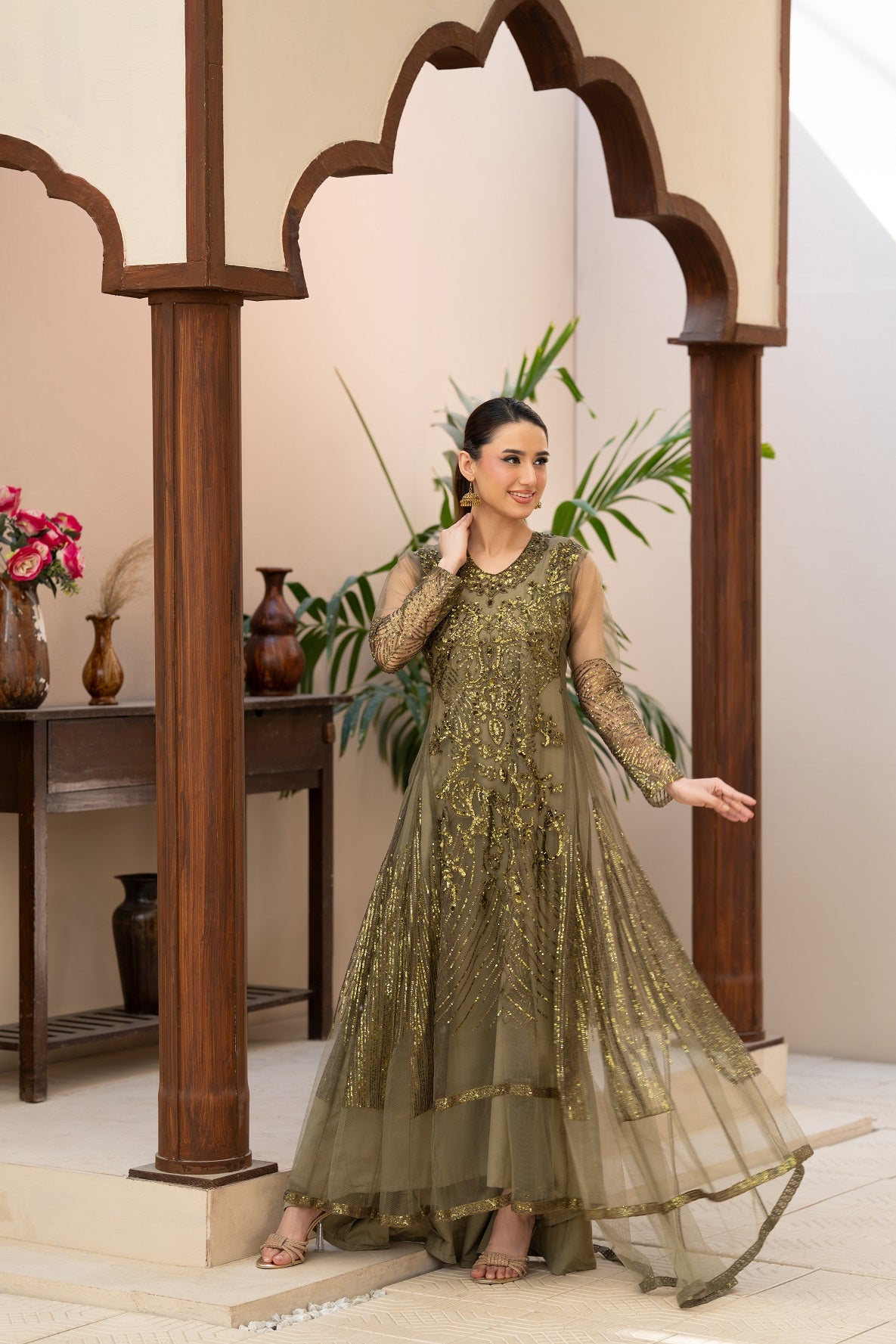 NF-6634 Mehndi Net Stitched Dress